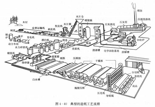 造紙是從木材、稻草、甘蔗渣、廢紙等原料中分離出纖維質(zhì),經(jīng)過洗滌、打漿等處理后,用造紙機支撐紙張的過程。根據(jù)所生產(chǎn)紙的種類,將上述兩種紙漿按適當(dāng)比例配合,再經(jīng)過洗滌、打漿等,由造紙機造成紙。造紙機制出的紙再經(jīng)涂布、復(fù)卷等精加工處理后出廠。整個過程可分為制漿、造紙和精整三大系統(tǒng)。典型的造紙工藝流程如圖4-40所示。
