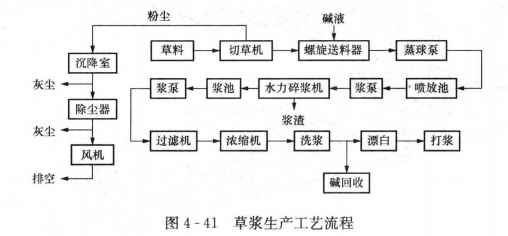 草漿生產(chǎn)工藝流程見圖4-41。其主要耗能設(shè)備有切草機、螺旋送料器、碎漿機、蒸球泵、漿泵、真空泵、打漿機等。