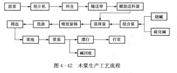 木漿的生產(chǎn)工藝流程見圖4-42。其主要耗能設(shè)備是削片機、螺旋送料器、混合泵、噴放鍋泵、黑液泵、熱水泵、白水泵、真空泵、打漿機等。