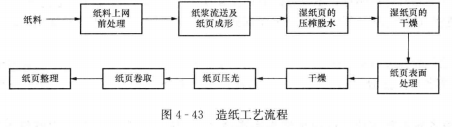 造紙工藝流程大同小異,包括漿料的制備和抄造兩部分,基本的流程如圖4-43所示。