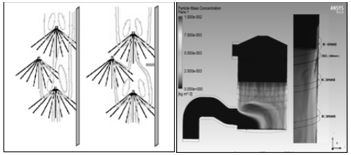 2.開發(fā)了具有氣液耦合的精細化噴淋脫硫除塵技術,主要包括噴淋層精細化布置和無壁流吸收塔技術,解決了塔內氣液分布不均、同一截面氣液比不合理以及壁流等問題,避免了煙氣走廊現(xiàn)象,提高了漿液有效利用率。開發(fā)了噴淋層精細化布置技術,結合噴淋脫硫原理,在不同噴淋層設計不同漿液量、噴嘴類型和霧化參數(shù)等,使每一層漿液都能有效利用,同時采用雙頭噴嘴、改善霧化參數(shù),增強二次霧化效果,提高SO2傳質效果以及粉塵被液滴捕集的概率;根據(jù)煙氣流場分布特點,同一層噴淋層配置不同噴嘴密度,合理分配漿液量。