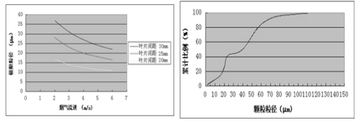 圖7:不同葉片間距下煙氣流速與霧滴極限粒徑的關系及漿液中的石膏粒徑分布