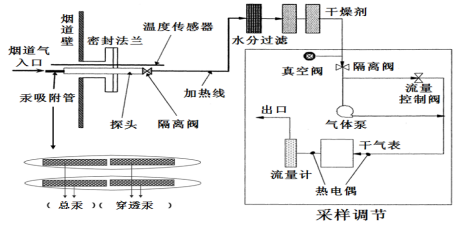 汞去除測(cè)試試驗(yàn)采樣方法為EPAMethod30B標(biāo)準(zhǔn)方法,EPAMethod30B為美國(guó)環(huán)保局的標(biāo)準(zhǔn)方法,采用活性炭管對(duì)汞進(jìn)行吸附后分析,不需要繁瑣的化學(xué)處理步驟,操作相對(duì)簡(jiǎn)單。EPAMethod30B方法采樣系統(tǒng)的示意圖如圖4所示,氣體泵將煙氣通過(guò)探頭吸入,煙氣中的汞被安裝在探頭前端的吸附管所吸收,然后煙氣被干燥后在后面的采樣調(diào)節(jié)部分給出干煙氣的流量。整個(gè)采樣過(guò)程的煙氣量可以通過(guò)采樣調(diào)節(jié)部分的流量計(jì)和采樣時(shí)間來(lái)進(jìn)行控制。