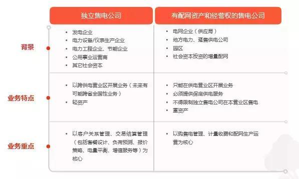 而從售電主體核心業(yè)務(wù)角度看,實質(zhì)上可分為二大類:一種是獨立售電公司,一種是有配網(wǎng)資產(chǎn)和經(jīng)營權(quán)的售電主公司。那么這兩大類企業(yè)的售電業(yè)務(wù)特點和重點是是什么呢?如下圖所示: