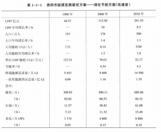 貴陽市能源發(fā)展最優(yōu)方案——強化節(jié)能方案低速度見表1-1-1。從表看出,貴陽市GDP產(chǎn)值1990-2000年年均增長率將達到10 %,2000-2010年達到8.5%,到2000年GDP產(chǎn)值達到115億元,到2010年達到261億元。貴陽市一次能源供應(yīng)總量1990年為230萬tce,到2000年將增加到390萬tce,到2010年增加到572萬tce。1990年煤炭、石油、水電在一次能源供應(yīng)構(gòu)成中分別為91.23%、8.74%、0.03%,到2000年為88.53%、11.32%、0.15%,到2010年為84.32%、15.49%、0.19 %,