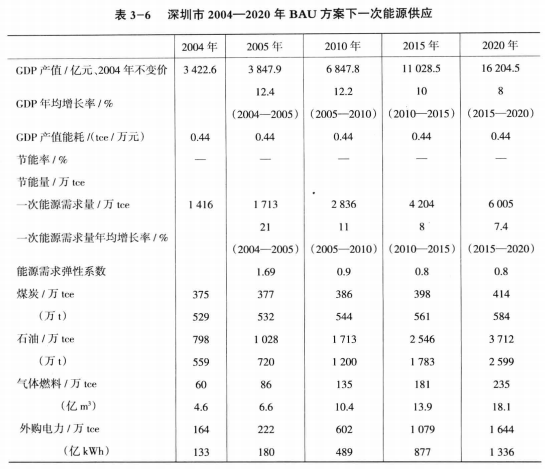 深圳市2004-2020年BAU方案下一次能源供應(yīng)列于表3-6。從表3-6可以看出,BAU方案下2005年一次能源需求量為l 713萬tce,2010年為2 836萬tce,2015年為4 204萬tce,2020年為6 005萬tce。能源彈性系數(shù)2004-2005年為1.69,2005-2010年為0.9,2010-2015年為0.8,2015-2020年為0.8。
