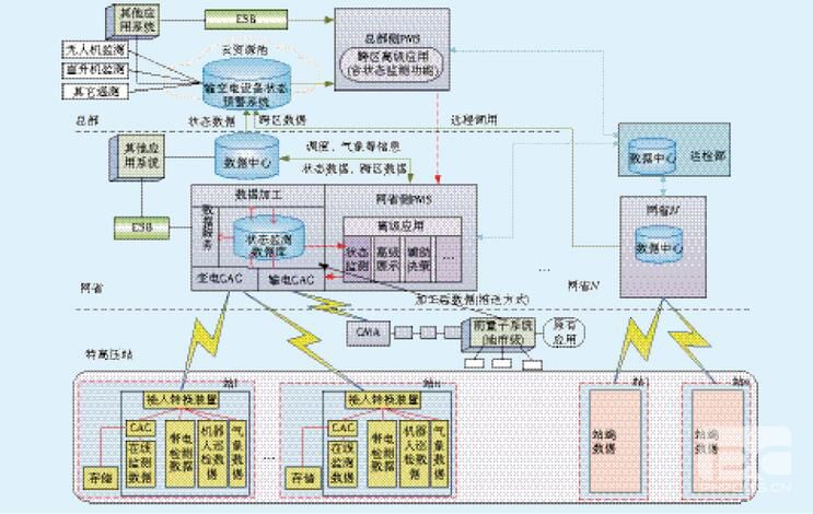輸變電設(shè)備各類監(jiān)測數(shù)據(jù)通過站內(nèi)狀態(tài)接入控制器(Condition Access Controller,CAC)或狀態(tài)監(jiān)測代理(Condition Monitoring Agent,CMA)上傳給網(wǎng)省公司狀態(tài)接入網(wǎng)關(guān)(Condition Acquisition Gateway,CAG)進(jìn)行存儲與加工,并為網(wǎng)省公司PMS提供數(shù)據(jù)服務(wù)。加工后的數(shù)據(jù)與PMS數(shù)據(jù)將在網(wǎng)省側(cè)數(shù)據(jù)中心匯總,其中,調(diào)度、覆冰等其他系統(tǒng)數(shù)據(jù)將由PMS直接提供。網(wǎng)省側(cè)數(shù)據(jù)利用企業(yè)服務(wù)總線(Enterprise Service Bus,ESB)與狀態(tài)預(yù)警系統(tǒng)主站進(jìn)行交互,同時在系統(tǒng)主站接入無人機(jī)、直升機(jī)以及部分其他監(jiān)測數(shù)據(jù)??紤]到數(shù)據(jù)的安全性,監(jiān)測數(shù)據(jù)需在異地作容災(zāi)備份,數(shù)據(jù)的異地容災(zāi)備份可利用現(xiàn)有的容災(zāi)資源,選擇其他城市的容災(zāi)中心存放監(jiān)測數(shù)據(jù)。輸變電設(shè)備狀態(tài)預(yù)警系統(tǒng)總體架構(gòu)如圖3所示。