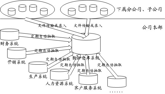 數(shù)據(jù)倉(cāng)庫(kù)/數(shù)據(jù)集市需要從公司總部和各分、子公司之間根據(jù)數(shù)據(jù)模型進(jìn)行數(shù)據(jù)抽取到數(shù)據(jù)中心,如下過(guò)程: