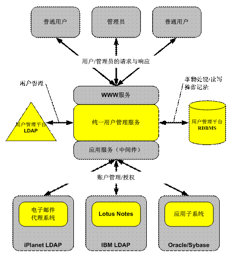 用戶管理平臺服務(wù)器是一個(gè)基于Java應(yīng)用服務(wù)器的J2EE應(yīng)用,它也包括一個(gè)Web服務(wù)器。用戶管理平臺所有對象的定義存儲在目錄樹中,而關(guān)系性數(shù)據(jù)庫中存儲的主要是交易記錄等無法存在目錄樹的其他數(shù)據(jù)。