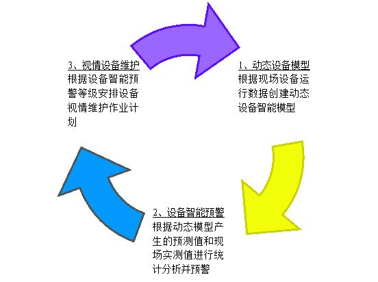 可以看出,通過(guò)設(shè)備狀態(tài)智能預(yù)警系統(tǒng)建立的設(shè)備狀態(tài)性能管理系統(tǒng),可以有效的結(jié)合了現(xiàn)有電廠信息化的投資,提高設(shè)備性能指標(biāo)的三個(gè)步驟在實(shí)際過(guò)程中形成一個(gè)循環(huán)運(yùn)行的環(huán)路,從而實(shí)現(xiàn)設(shè)備性能的連續(xù)改進(jìn)和提高,整個(gè)解決方案實(shí)現(xiàn)設(shè)備性能提高的示意圖如圖二所示: