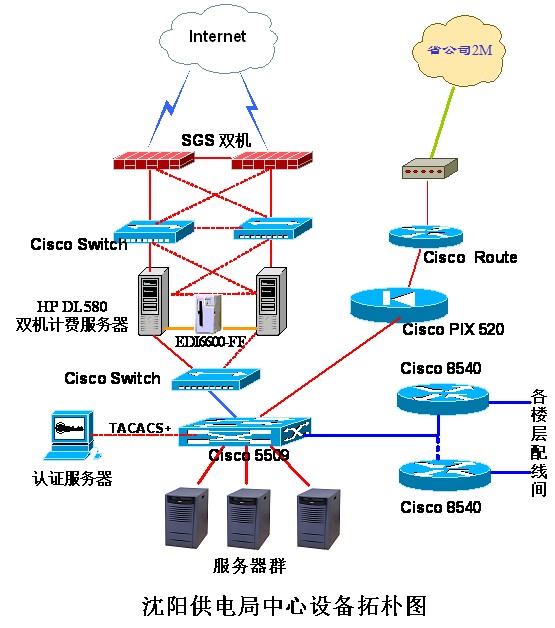 核心設(shè)備是使用兩臺運行LINUX操作系統(tǒng)的高性能HP DL580服務(wù)器作為計費網(wǎng)關(guān),通過雙機容錯和雙驅(qū)磁盤陣列系統(tǒng)可以確保網(wǎng)絡(luò)系統(tǒng)不間斷運行以及在線數(shù)據(jù)的安全,達(dá)到應(yīng)用系統(tǒng)的高可用性,并且能夠滿足數(shù)據(jù)的大容量增長及其可用性和安全性。網(wǎng)絡(luò)出口處采用雙Symantec防火墻,這樣無論從Internet 雙出口互備冗余通道的穩(wěn)定性還是網(wǎng)絡(luò)安全性、可靠性上都有了很大的改善。此設(shè)備集應(yīng)用代理、VPN防護,入侵檢測多功能合于一身,大大增強了網(wǎng)絡(luò)安全性,解決了單點故障的問題。Internet出口采用兩條出口,服務(wù)器采用雙機做負(fù)載均衡,合理控制外網(wǎng)訪問,避免了單點故障的出現(xiàn)、保障了網(wǎng)絡(luò)的暢通。