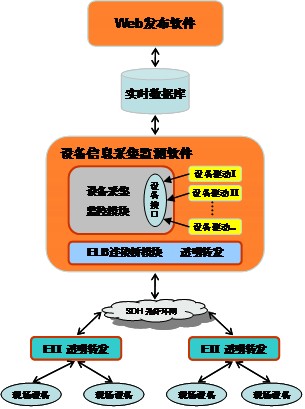 設(shè)備運(yùn)行狀態(tài)信息采集系統(tǒng)(EIS)的現(xiàn)場(chǎng)集中采集裝置——設(shè)備運(yùn)行狀態(tài)采集儀(EII)可以接入變電站各類應(yīng)答型智能監(jiān)測(cè)設(shè)備,并對(duì)各類設(shè)備的接入數(shù)據(jù)采用透明轉(zhuǎn)發(fā)技術(shù),通過以太網(wǎng)將實(shí)時(shí)信息遠(yuǎn)程傳送到局端的數(shù)據(jù)中心。局端的設(shè)備運(yùn)行狀態(tài)信息采集監(jiān)測(cè)管理軟件可以和設(shè)備狀態(tài)采集儀進(jìn)行通訊,處理上傳的設(shè)備運(yùn)行狀態(tài)數(shù)據(jù),經(jīng)過數(shù)據(jù)規(guī)約解釋,將處理后的設(shè)備信息數(shù)據(jù)存入實(shí)時(shí)數(shù)據(jù)庫。同時(shí),采集檢測(cè)管理軟件還可以向現(xiàn)場(chǎng)采集儀發(fā)送采集數(shù)據(jù)和設(shè)備遙控的指令。生產(chǎn)運(yùn)行和管理人員通過Web發(fā)布軟件從數(shù)據(jù)庫中獲得數(shù)據(jù),查詢并處理變電所現(xiàn)場(chǎng)設(shè)備運(yùn)行狀態(tài)信息。