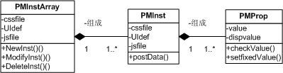 在某個具體的應(yīng)用中,涉及的對象可以是單個對象實例,也可以是多個對象實例。為在數(shù)據(jù)表現(xiàn)層中實現(xiàn)一個或多個對象實例的統(tǒng)一處理,我們定義了PMInstArray類。PMInstArray類提供了對象管理方法:包括新增、刪除、修改,及整體頁面定義和操作定義等等。