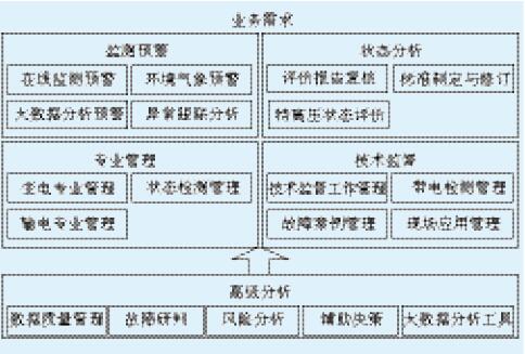 業(yè)務(wù)需求,即公司業(yè)務(wù)目標(biāo)及業(yè)務(wù)流程的分類描述,電網(wǎng)公司通過業(yè)務(wù)流程為政府、企業(yè)和居民等客戶提供電力服務(wù)、資產(chǎn)管理等業(yè)務(wù)。輸變電設(shè)備狀態(tài)預(yù)警系統(tǒng)主要為電網(wǎng)運檢業(yè)務(wù)提供技術(shù)支撐,運檢業(yè)務(wù)主要包括電力資產(chǎn)的維護、操作、管理與改造工作,狀態(tài)預(yù)警系統(tǒng)可為運檢業(yè)務(wù)提供監(jiān)測預(yù)警、狀態(tài)分析、專業(yè)管理、技術(shù)監(jiān)督、高級分析五大類業(yè)務(wù)應(yīng)用,為電網(wǎng)公司運檢業(yè)務(wù)提供全面的技術(shù)支撐。狀態(tài)預(yù)警系統(tǒng)業(yè)務(wù)需求框架如圖1所示。