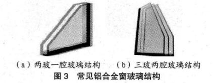 為滿足鋁合金密保溫性能要求,國(guó)內(nèi)鋁合金窗玻璃結(jié)構(gòu)一般為兩玻一腔或三玻兩腔結(jié)構(gòu),如圖3所示。兩種玻璃結(jié)構(gòu)的主要區(qū)別在于三玻兩腔的玻璃結(jié)構(gòu)具有更好的隔音和保溫性能。