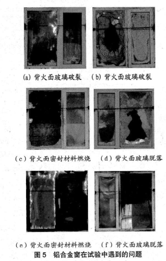 (4)鋁合盒窗玻璃壓條有問(wèn)題:在耐火試驗(yàn)過(guò)程中,爐內(nèi)達(dá)較高的溫度,壓條軟化脫落,導(dǎo)致玻璃脫落,如圖5(e)所示。