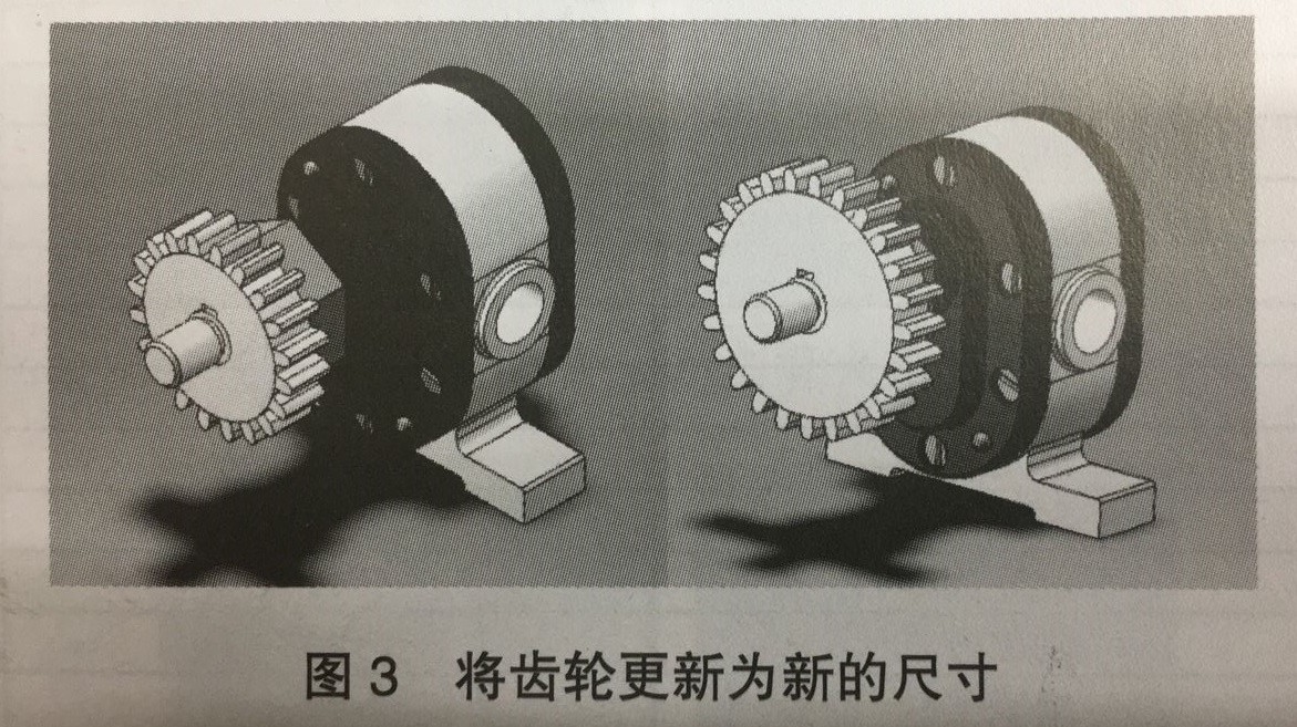 上述程序在運(yùn)行前,首先需更改一個(gè)零部件的尺寸,然后進(jìn)行“自動(dòng)裝配”操作,程序會(huì)自動(dòng)將橫板相對(duì)應(yīng)的文件更新為當(dāng)前新的零最后更新裝配體,就實(shí)現(xiàn)了自動(dòng)裝配。如果要更新其它零部件,上述操作,即可得到新的裝配體。圖3為更新齒輪后前后對(duì)比。