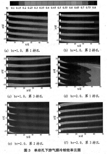 吹風(fēng)比的大小代表了冷氣穿透主流邊界層進(jìn)入主流核心區(qū)的能力。圖3為單排孔在bf=1.0和br=2.0時的氣膜冷卻效率云圖。從圖中可以看出在同一吹風(fēng)比下,第1排孔展向擴(kuò)散特性最好?;鲃臃较颍?排扎在下游實現(xiàn)了氣膜全覆蓋,第2和第3排孔下游一直存在冷卻死區(qū)。隨著吹風(fēng)比的增大,冷氣在展向偏移更加明顯。