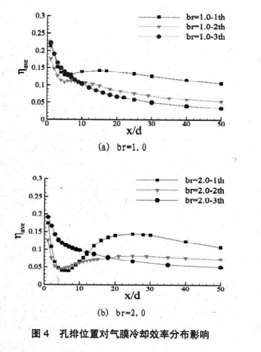 圖4給出了在吹風(fēng)比為1.0和2.0時,所對應(yīng)的孔下游氣膜冷卻效率隨x/d的變化情況。圖4(a)是在br=l.0時,x/d<7,第3排孔冷卻效率最高,因為第3排孔孔徑最大且孔間距最小,同樣的吹風(fēng)比下,能更好的實現(xiàn)氣膜覆蓋。x/d>10時,第1排孔冷卻效率最高。第3排孔冷卻效率最低,這是因為第1排孔離滯止線最遠(yuǎn),第3排孔離滯止線最近。當(dāng)氣膜孔位置后移時,所對應(yīng)的主流區(qū)的速度也變大,相對減弱了吹風(fēng)比的影響。圖4(b)是br2=0時,第1,2,3排孔展向平均氣膜冷卻效率隨x/d的變化。x/d<12時,第3排孔的冷卻效率最高,這說明吹風(fēng)比增大,會加強(qiáng)孔徑和孔間距對氣膜冷卻效率的影響。5