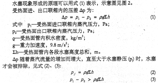 鍋妒啟動(dòng)或者低負(fù)荷運(yùn)行時(shí),此時(shí)蒸汽在管內(nèi)流速很低,受熱面進(jìn)出口聯(lián)箱壓差很小,僅以此壓差無法排除管內(nèi)積水,因而會(huì)產(chǎn)生較長(zhǎng)時(shí)間的水塞。