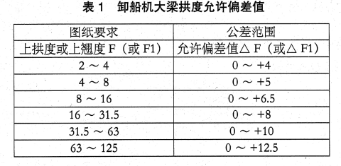 (5)前后大梁在安裝小車軌道后,由于焊接軌道壓板會使原有拱度發(fā)生變化,所以施焊后需對梁的拱度做一次檢測,其允許偏差不得超過表1規(guī)定。 (遇有特殊要求,需按照圖紙要求執(zhí)行)