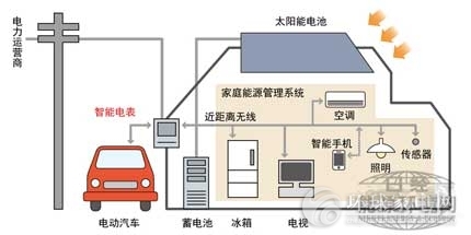 在住宅中采用智能電表的概念圖。利用無線功能對與節(jié)能、創(chuàng)能、蓄能有關(guān)的設(shè)備利用狀況進行管理,促進用戶進行優(yōu)化利用。作為用戶終端,也在考慮利用智能手機等。