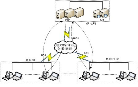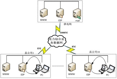 現(xiàn)有地、縣EIP系統(tǒng)中,供電局與縣公司的EIP相互獨(dú)立,盡管EIP系統(tǒng)都是由統(tǒng)一的廠家開發(fā),有著基本相同的架構(gòu)和版面。縣公司的PC通過本地的局域網(wǎng)范圍EIP,不會(huì)對電力綜合業(yè)務(wù)數(shù)據(jù)網(wǎng)產(chǎn)生壓力。