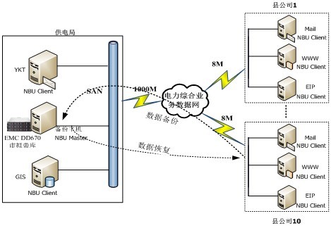 在昆明供電局需要進(jìn)行數(shù)據(jù)備份的GIS、Mail、YKT等系統(tǒng)和縣公司Mail、WWW、EIP等系統(tǒng)上安裝Symantec NetBackUp Client 7.1。昆明供電局備份主機(jī)通過電力綜合業(yè)務(wù)數(shù)據(jù)網(wǎng)定期將昆明供電局和縣公司的業(yè)務(wù)系統(tǒng)數(shù)據(jù)備份至昆明供電局?jǐn)?shù)據(jù)中心,實(shí)現(xiàn)對業(yè)務(wù)系統(tǒng)數(shù)據(jù)的集中備份和恢復(fù),當(dāng)系統(tǒng)發(fā)生臨時(shí)故障時(shí),可以快速進(jìn)行數(shù)據(jù)恢復(fù)。此時(shí),縣公司的業(yè)務(wù)系統(tǒng)等同于昆明供電局本地的業(yè)務(wù)系統(tǒng)。地、縣一體化數(shù)據(jù)備份系統(tǒng)拓?fù)鋱D如圖3所示。