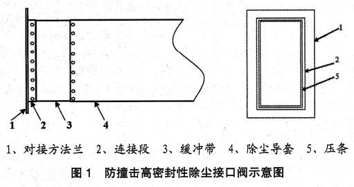 對(duì)接方法蘭1用鋼板制成,一端為對(duì)接平面,另一端通過(guò)連接段2與緩沖帶3連接,用壓條5固定連接;所述緩沖帶3由帶線層的皮帶制成,一端與方法蘭1連接,另一端與活動(dòng)導(dǎo)套4連接,連接方式為螺栓連接,便于更換;所述除塵導(dǎo)套4用鋼板制成,由液壓頂桿驅(qū)動(dòng)頂出,完成接口閥與除塵管道的對(duì)接。改造后結(jié)構(gòu)簡(jiǎn)單、工作可靠、制造成本低、維修方便、避免了因撞擊對(duì)除塵裝囂造成損壞,起到保護(hù)除塵裝置和提高接口窯封性的作用。