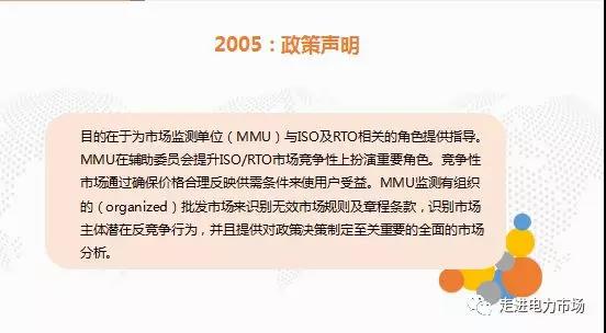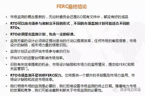 最終FERC下了一個(gè)結(jié)論, RTO必須要制定一個(gè)市場(chǎng)監(jiān)測(cè)計(jì)劃。主要的目標(biāo)看你的市場(chǎng)設(shè)計(jì)有沒有缺陷,有沒有市場(chǎng)力,同時(shí)還要判別RTO本身運(yùn)營(yíng)是否影響市場(chǎng)效率。
