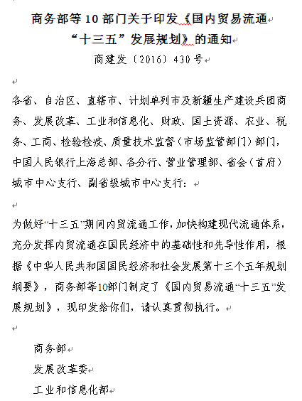 近日,商務部、發(fā)展改革委、工業(yè)和信息化部、財政部、國土資源部、農業(yè)部、人民銀行、稅務總局、工商總局、質檢總局等10部門聯合發(fā)布《國內貿易流通“十三五”發(fā)展規(guī)劃》(以下簡稱《規(guī)劃》)。《規(guī)劃》在全面建成小康社會進入決勝階段、供給側結構性改革深入推進的背景下出臺,對于完善內貿流通體制機制,建設法治化營商環(huán)境,加快構建現代流通體系,推動從流通大國向流通強國轉變具有重要意義。