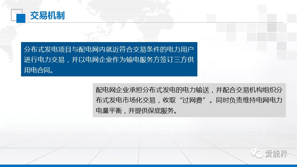 分布式發(fā)電是接入配電網(wǎng)運行、發(fā)電量就近消納的中小型發(fā)電設施。分布式發(fā)電項目與配電網(wǎng)內(nèi)就近符合交易條件的電力用戶進行電力交易,并以電