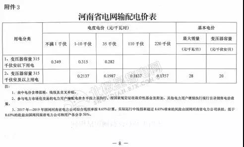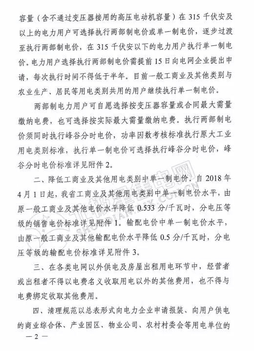 河南省發(fā)改委日前發(fā)布了關(guān)于2018年電價調(diào)整有關(guān)事項的通知,通知提出,自2018年4月1日起,河南省工商業(yè)及其他用電類別中單一制電價水平,由原一般工商業(yè)及其他電價水平降低0.533分/千瓦時;輸配電價中單一制電價水平,由原一般工商業(yè)及其他輸配電價水平降低0.5分/千瓦時,分電壓等級的具體情況詳見附件。