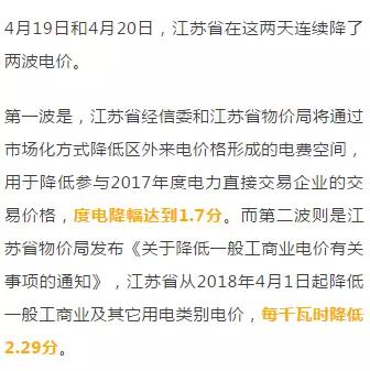 另外,根據(jù)國家發(fā)改委官方網(wǎng)站發(fā)布的《2017年江蘇省電力直接交易規(guī)模居全國首位》,江蘇省2017年全省電力直接交易規(guī)模達(dá)到1265億千瓦時,降低用戶電費支出約26億元。按照上面的兩個數(shù)字,我們大概可以算出江蘇2017年全年電力直接交易平均降價幅度為2.055分/千瓦時。而第一波直接交易降電價的幅度已經(jīng)達(dá)到2017年平均降幅的82.73%,這相當(dāng)于這部份電力用戶又多優(yōu)惠了一年電費。