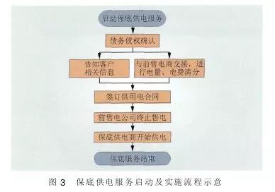 對于前兩類,主要由保底供電商(電網(wǎng)企業(yè)或配電網(wǎng)運營者)按政府核定價格供電。對于第3類用戶,當售電公司無法為其提供售電服務時,按照《有序放開配電網(wǎng)業(yè)務管理辦法》,要求配電網(wǎng)運營者直接啟動保底供電服務。保底供電服務流程目前尚不清晰,參照國外實踐經(jīng)驗,建議保底供電服務實施流程如下:保底供電商啟動保底供電服務,告知用戶相關信息,與原售電公司進行交接,進行電量、電費清分;征得用戶同意后簽訂供用電合同,原售電公司與用戶簽訂合同隨之中止;保底供電商按政府核定價格進行保底供電。當用戶選擇其他售電公司,辦理完相關更換程序后,保底供電服務終比。具體流程如圖3所示。