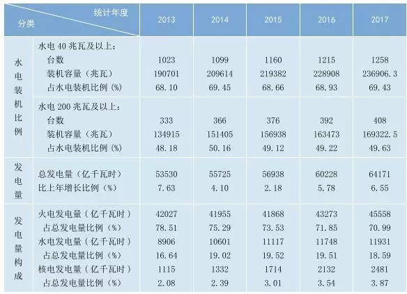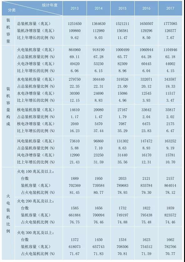 截止2017年底,全國發(fā)電裝機容量達17.8億千瓦,同比增長7.7%。其中火電裝機11.0億千瓦,占62.2%;水電裝機3.4億千瓦,占19.3%;核電裝機3582萬千瓦;風電裝機1.6億千瓦;并網(wǎng)太陽能發(fā)電裝機1.3億千瓦。2017年,我國非化石能源發(fā)電裝機占全國總裝機的38.8%,比2016年提高2.2個百分點;非化石能源發(fā)電量同比增長10.1%,占全國發(fā)電量的30.3%,比2016年提高了1.0個百分點。2017年,人均裝機和年人均用電量分別達到1.3千瓦、4616千瓦時。