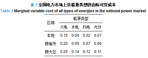 由于電動汽車用電負(fù)荷與風(fēng)電、光伏等新能源發(fā)電基地在空間分布上并不完全一致,需要考慮跨區(qū)域輸送的成本。目前大區(qū)電網(wǎng)內(nèi)跨省市電力輸送成本約為0.05元/(kW˙h),而利用特高壓直流等通道跨大區(qū)進(jìn)行電力輸送的成本約為0.10元/(kW˙h),即使考慮跨省跨區(qū)輸送成本,異地新能源在邊際成本上仍然較火電有著一定的優(yōu)勢,如表2所示。由此可見,充電設(shè)施用電需求參與大用戶直接交易,對于新能源富余電力的消納也有著積極的意義。