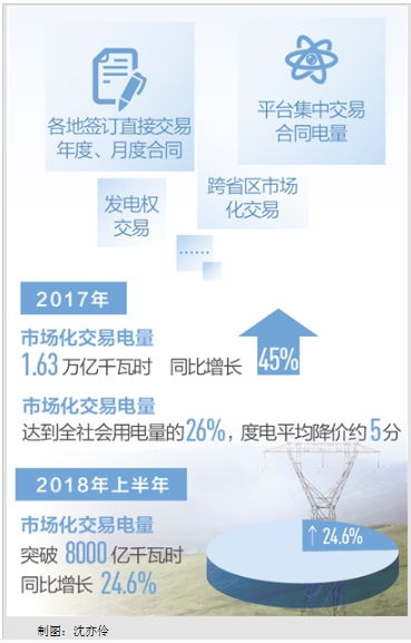 改革在市場化、降成本等方面效果初顯。2017年,各地簽訂直接交易年度、月度合同以及平臺集中交易合同電量,加上跨省區(qū)市場化交易、發(fā)電權(quán)交易等其他交易品種,累計完成市場化交易電量1.63萬億千瓦時,同比增長45%;市場化交易電量達(dá)到全社會用電量的26%,度電平均降價約5分。上半年,電力市場化交易繼續(xù)推進(jìn),交易品種形式不斷創(chuàng)新豐富,市場化交易電量累計突破8000億千瓦時,同比增長24.6%。