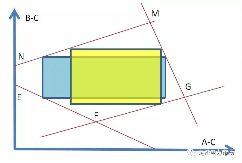 如圖1所示,假設(shè)系統(tǒng)中存在三個區(qū)域A、B和C,橫坐標表示AC兩個區(qū)域之間的交換功率,縱坐標表示BC兩個區(qū)域之間的交換功率。圖中四條紅色的線條表示系統(tǒng)中的一些線路造成的網(wǎng)絡(luò)約束。也就是說,考慮到電網(wǎng)的各種約束,AC、BC之間的傳輸功率必須進行一些協(xié)調(diào),需要在紅色的線條圍起來的范圍之內(nèi),即五邊形EFGMN之內(nèi)。如果想要讓AC之間的傳輸功率盡量大,應(yīng)該運行在G點;如果想讓BC之間的傳輸功率盡量大,應(yīng)該運行在M點。實際運行中,AC、BC的傳輸功率只要在EFGMN內(nèi),系統(tǒng)就是安全的、可行的。
