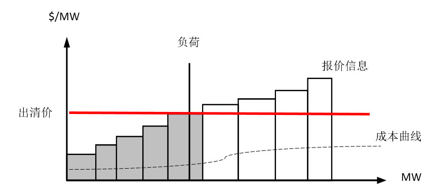 圖2用更簡潔的方式圖示了單邊現(xiàn)貨競價的過程,假設發(fā)電機組申報的是階梯狀的報價曲線,則ISO按報價由低到高對發(fā)電機組申報的容量(電量)段進行排隊,直至發(fā)電機組總出力能夠滿足系統(tǒng)負荷,圖中陰影部分機組中標,而報價最高的中標機組確定市場價格,這種競價出清用Excel表格處理就足夠了。