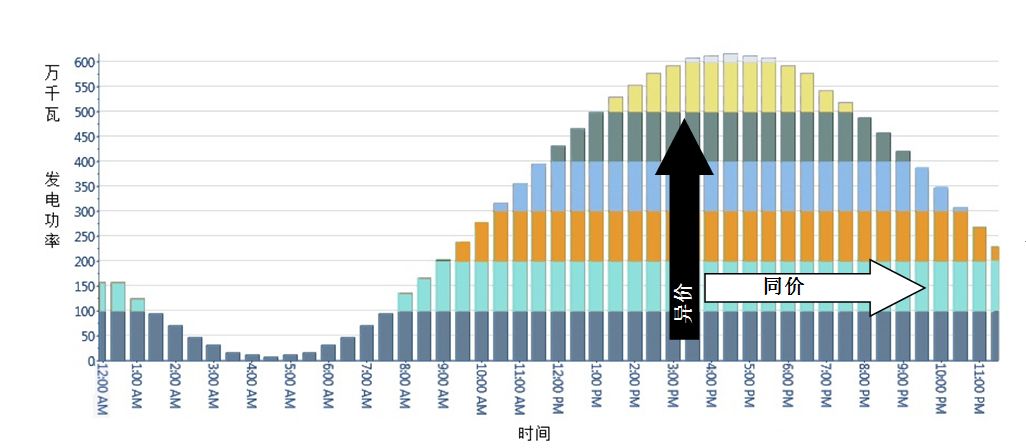 由于“同質同價”是市場中商品定價的基本原則,這種定價方式實際隱含了一種假設,即同一時段負荷下的所有電能商品是同質的,因此都取相同的邊際價格;而不同時段負荷下的電能商品是異質的,因此不同時段的負荷有不同價格。在這種假設下,如圖3所示,對于同一個發(fā)電廠(即由多個相同顏色的小矩形組成的橫條),隨時間不同所生產(chǎn)的電能商品的價格是不同的,這并不符合電力系統(tǒng)運行的實際(因為只要發(fā)電功率不變,同一個發(fā)電廠在不同時段的發(fā)電成本并無差異,如圖4所示);而對同一時段(不同顏色組成的豎條),所有電能商品都是同價的,無法區(qū)別基荷、腰荷和峰荷機組區(qū)別明顯的技術特征及成本構成,這也是不符合電力系統(tǒng)運行的實際情況的。根據(jù)前面的推導和圖4可判斷,拉格朗日乘子實際上只能反映每個時段的邊際機組的邊際成本,無法為該時段發(fā)電的全部機組合理定價(后文還將對此問題進行詳述)。在可再生能源大規(guī)模接入的背景下,世界各國基于這種定價機理所建立的電力市場運行紛紛出現(xiàn)問題,因此都在改進市場設計。