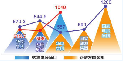 2017年,華能集團核準(zhǔn)低碳清潔能源項目619.7萬千瓦;投產(chǎn)新機679.3萬千瓦,其中投產(chǎn)低碳清潔能源裝機532.3萬千瓦。大唐集團全年完成核準(zhǔn)電源項目598萬千瓦,清潔能源占比60.67%;全年投產(chǎn)發(fā)電容量844.5萬千瓦,清潔能源占比55.31%。華電集團全年核準(zhǔn)電源項目1049萬千瓦,均為清潔能源;投產(chǎn)557萬千瓦。國家能源集團新投產(chǎn)裝機590萬千瓦。國家電投集團新增電力裝機1200萬千瓦,其中新能源投產(chǎn)裝機673萬千瓦,創(chuàng)歷史新高。