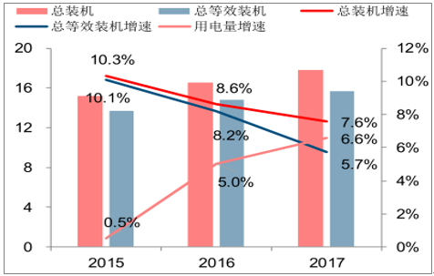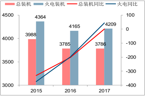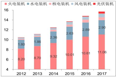 近幾年,電力行業(yè)受供給側(cè)改革的影響,全國發(fā)電裝機(jī)容量增長趨勢出現(xiàn)放緩跡象,但仍然保持在高于用電量增速的較快增長水平。以2017年為例,