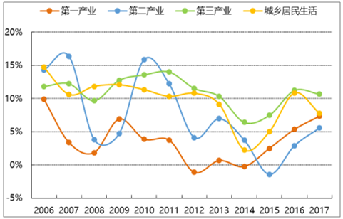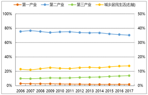2006-2017年,全社會(huì)用電量同比增速呈階梯狀下降趨勢(shì),和第二產(chǎn)業(yè)用電量增速近乎嚴(yán)格正相關(guān)。雖然,第二產(chǎn)業(yè)用電量占比逐年下降,仍處在 70%左右,是影響全社會(huì)用電量的絕對(duì)主力。第二產(chǎn)業(yè)的主體是制造業(yè),其中用電量占比較高的為:紡織業(yè)、化學(xué)原料及化學(xué)制品制造業(yè)、橡膠和塑料制品業(yè)、非金屬礦物制品業(yè)、黑色金屬冶煉及壓延加工業(yè)、有色屬冶煉及壓延加工業(yè)、金屬制品業(yè)、通用及專用設(shè)備制造業(yè)、交通運(yùn)輸、電氣、電子設(shè)備制造業(yè)。