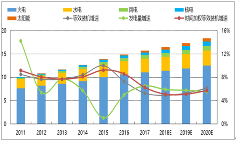 預(yù)測(cè) 2018-2020 年等效裝機(jī)利用小時(shí)數(shù)分別為 4227、 4253、 4246,均好于 2017 年 4194 小時(shí)。 2011-2016 年,等效裝機(jī)利用小時(shí)數(shù)逐年下滑, 2017-2020E 年開始觸底回升。從全國(guó)發(fā)電設(shè)備平均利用小時(shí)數(shù)來看, 2011-2020E 年期間卻幾乎持續(xù)下滑,主要是由于利用小時(shí)數(shù)較低的可再生能源裝機(jī)占比逐年上升,拉低了全國(guó)發(fā)電設(shè)備平均利用小時(shí)數(shù)。實(shí)際上, 2017 年開始火電、核電、風(fēng)電和太陽(yáng)能利用小時(shí)數(shù)均有所回升。綜合來看,等效裝機(jī)利用小時(shí)數(shù)更能準(zhǔn)確衡量發(fā)電設(shè)備利用率。