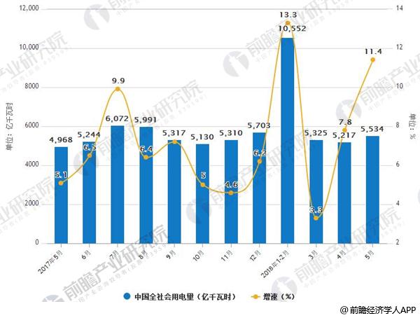 2017-2018年5月中國(guó)全社會(huì)用電量及增長(zhǎng)情況