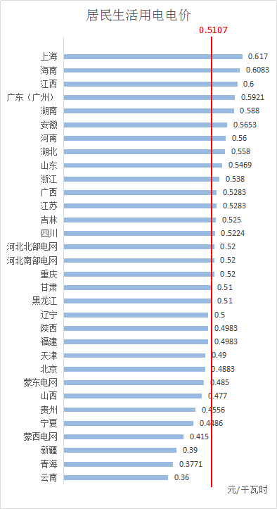 據(jù)公開電價信息的不完全統(tǒng)計,全國居民生活用電平均電價約為0.5107元/千瓦時,其中,上海最高為0.617元/千瓦時,云南最低為0.36元/千瓦時。