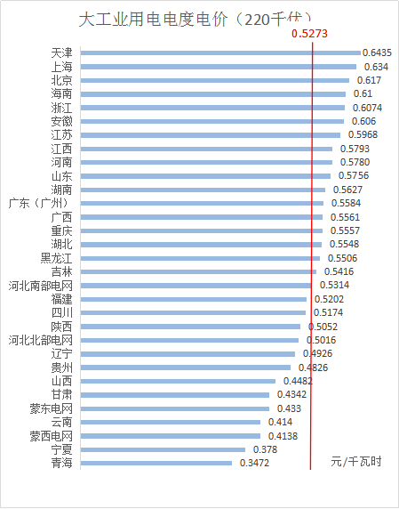 4、220千伏電壓等級下,全國平均電價約為0.5273元/千瓦時,其中,天津最高為0.6435元/千瓦時,青海最低為0.3472元/千瓦時。