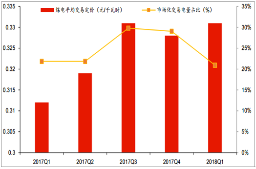 根據(jù)中電聯(lián)發(fā)布的2018年一季度全國電力市場交易信息披露,2018年1季度,我國煤電市場化交易平均電價為0.331元/千瓦時,較2017年同期增加1.9分/千瓦時,同比回升5.9%。
