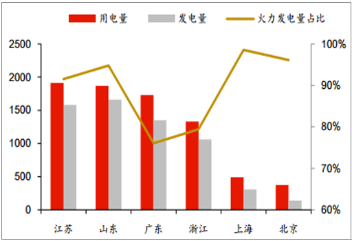 2018年1-4月,華東和華南用電量占全社會用電量比例分別為35%、11%,其中江蘇、山東、廣東、浙江用電量占比位居前列。這些用電需求旺盛的省份的用電量均明顯大于發(fā)電量,且省內(nèi)主要以火力發(fā)電為主。